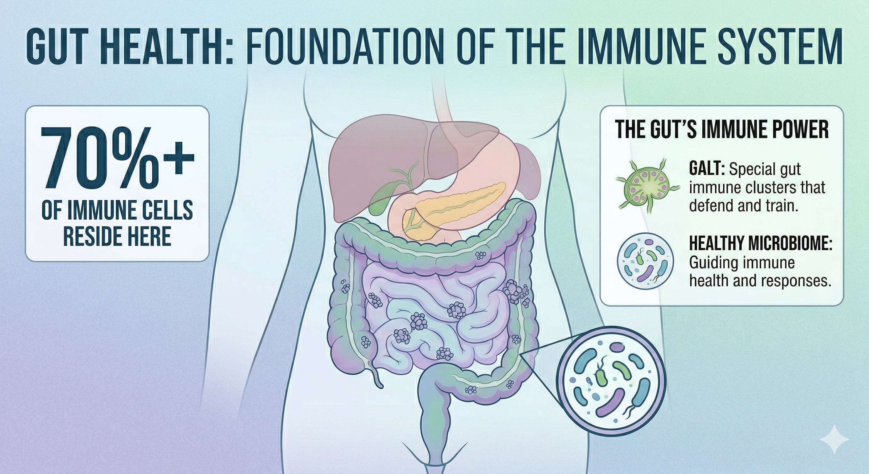 About 70–80% of immune cells reside in the gut-associated lymphoid tissue (GALT). As a result, if your gut microbiome is compromised, this can negatively affect immune system function.